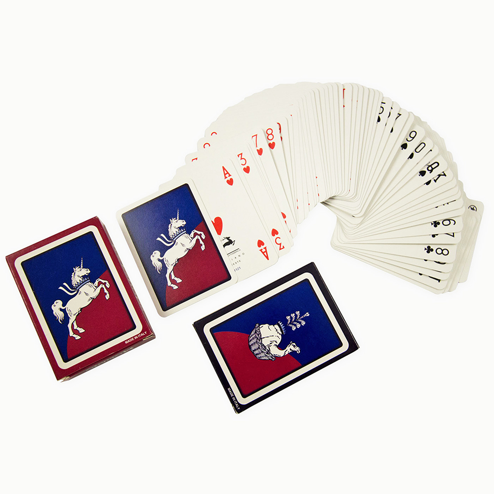 Due mazzi di carte da poker della storica marca Modiano, dedicati alle proprietà Borromeo. Un’idea regalo per giocatori e collezionisti, resa speciale dai motivi decorativi che rappresentano il cammello e l’unicorno, simboli rappresentati nello stemma araldico Borromeo, nei colori della bandiera della famiglia: il rosso e il blu.
