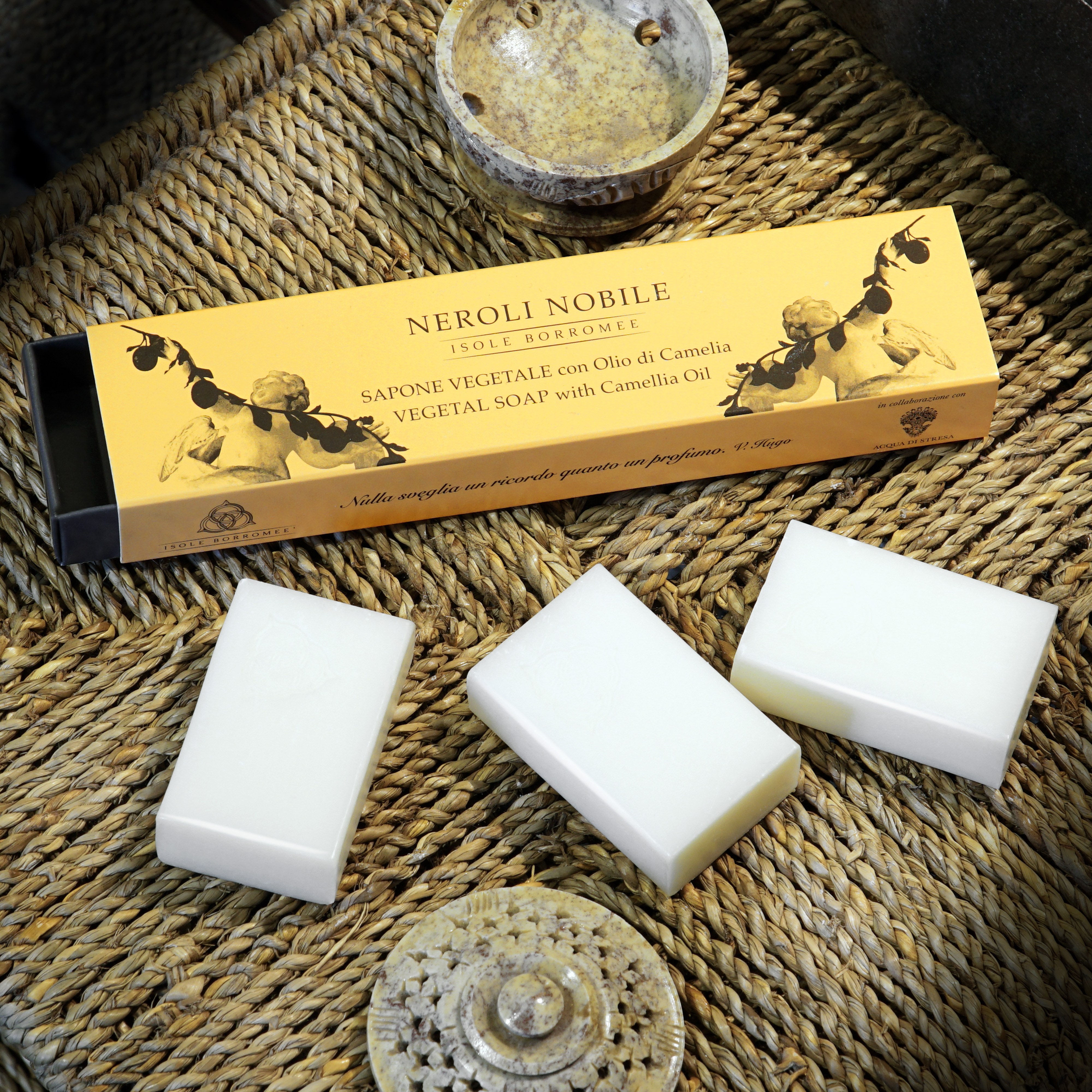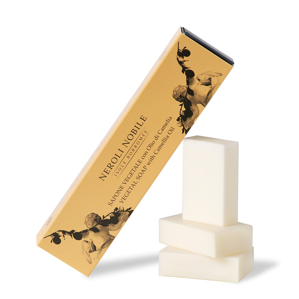 Sapone vegetale con olio di camelia che viene utilizzato in cosmetica per le sue proprietà idratanti e anti-aging e la consistenza leggera. Il suo profumo lieve è abbinato all’essenza agrumata ma addolcita da un cuore fiorito e da un fondo speziato del Neroli Nobile. La confezione è pensata per essere utilizzata anche come kit da mettere a disposizione degli ospiti. Ogni saponetta ha una forma rettangolare ed è avvolta in carta bianca su cui è inciso lo stemma della famiglia Borromeo.